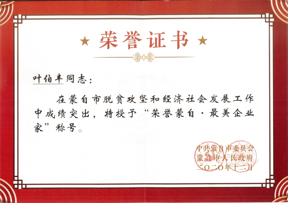 此次获奖,是蒙自市委、市政府对叶伯丰同志在蒙自市脱贫攻坚和经济社会发展中所做贡献的充分肯定。