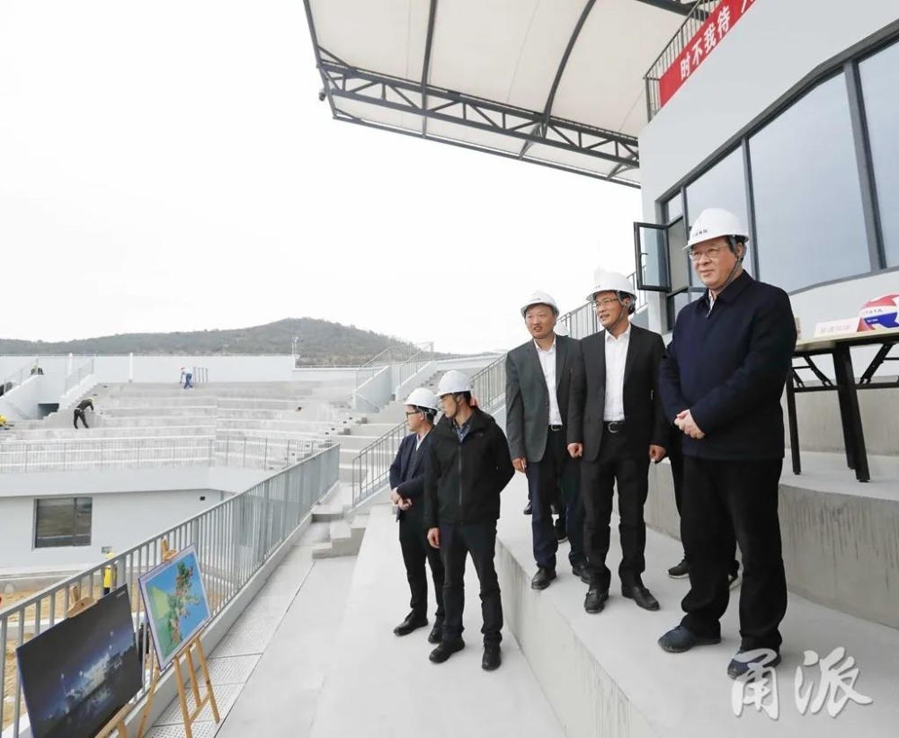 彭佳学首先来到石浦半边山考察亚运沙排项目场地。目前,主场馆建设已进入尾声,本月就将竣工投用。彭佳学进场馆、登看台,仔细查看项目建设情况,详细询问场地用沙材质、比赛用球规范及相关配套设施等细节问题。他说,要严格遵循国际标准、国家相关规定,一丝不苟抓细节、精益求精提品质,更好满足运动员和观众的需求。彭佳学还要求相关部门提前谋划后续经营利用,科学规划休闲旅游业态,挖掘消费潜力,培育消费热点,助力运动休闲小镇建设。