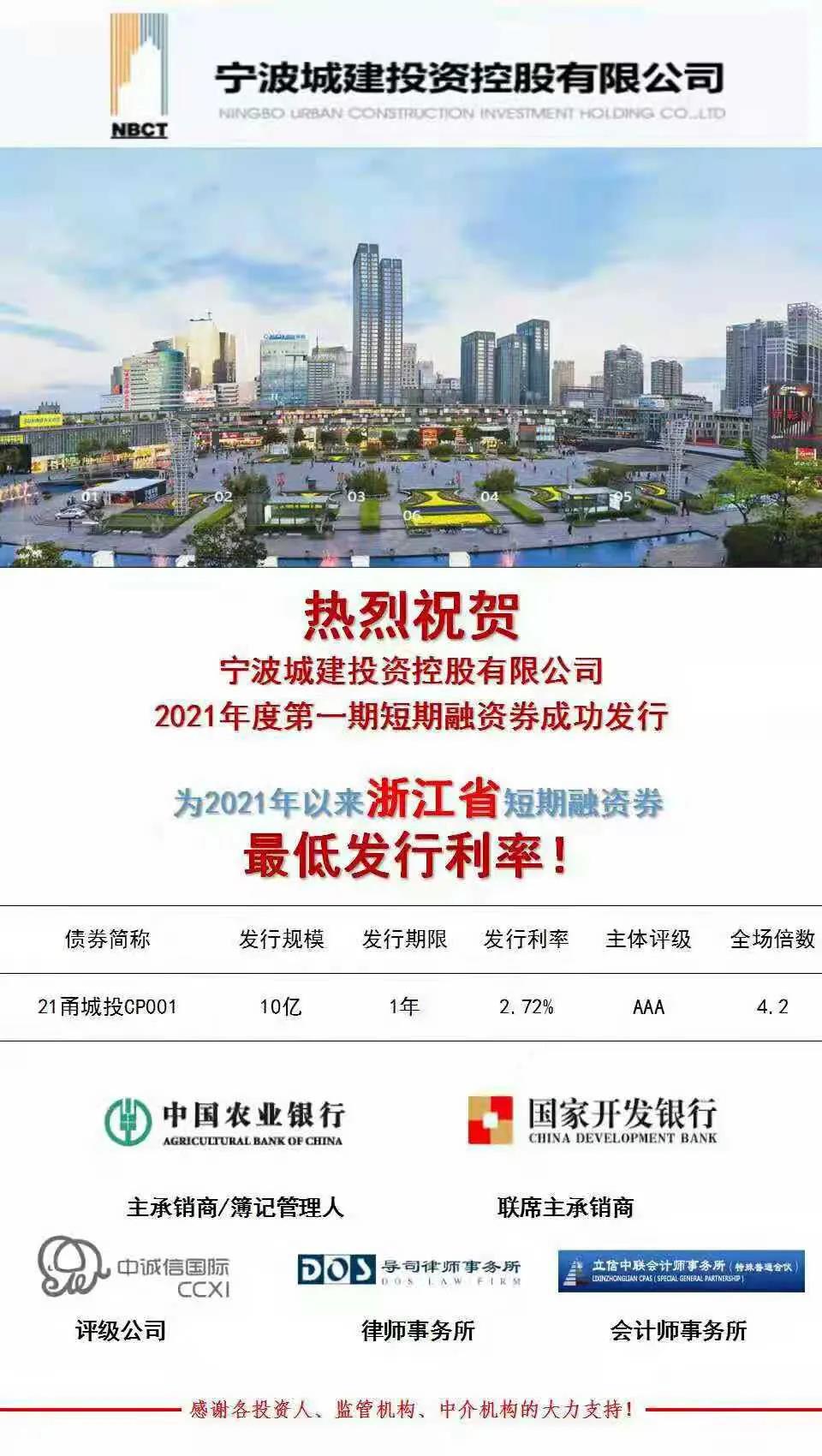 8月24日,伟德国际1949公司2021年度第一期短期融资券成功发行,本期债券由农行主承、国开行联席,金额10亿元,票面利率2.72%,期限365天,创下浙江地区今年以来短期融资券最低利率。