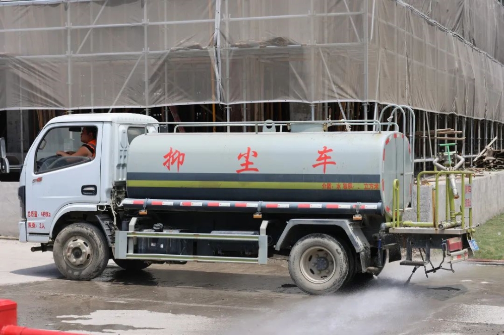 望春保障房项目现场工作人员通过抑尘车给工地地面洒水。
