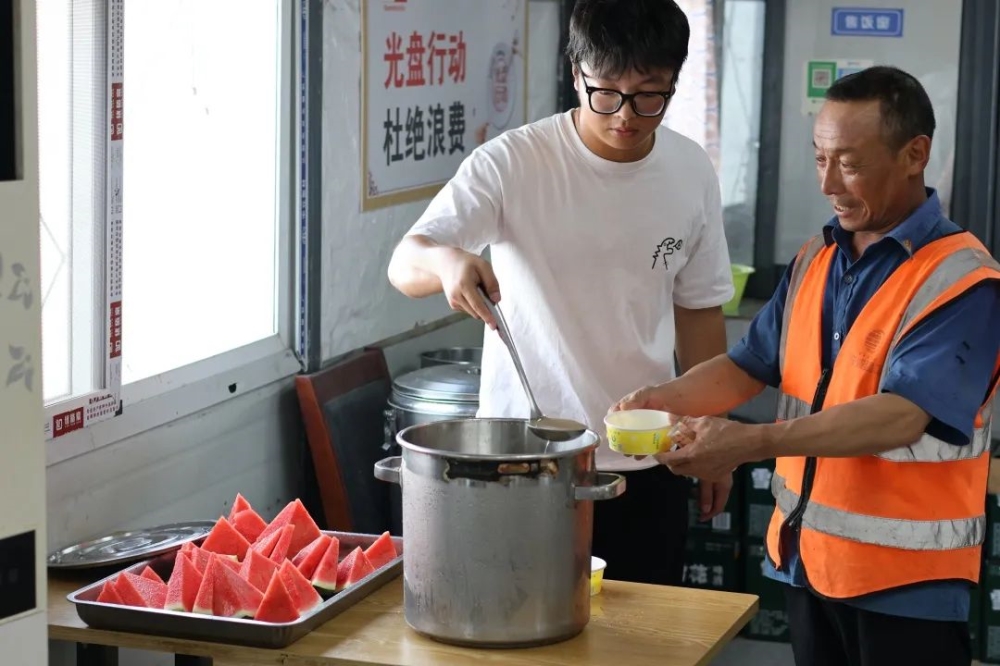 江南明二保障房项目工地食堂常态化为工人们准备冰镇绿豆汤和西瓜。