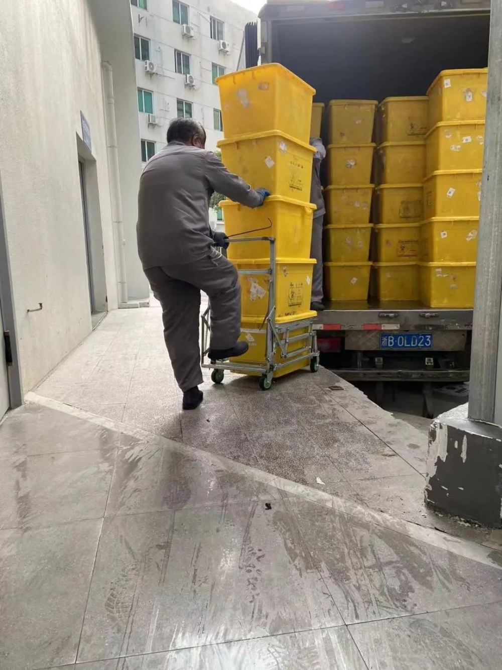 特废公司驾驶员完成应急收运任务和装卸人员一起搬运医疗废物周转箱。