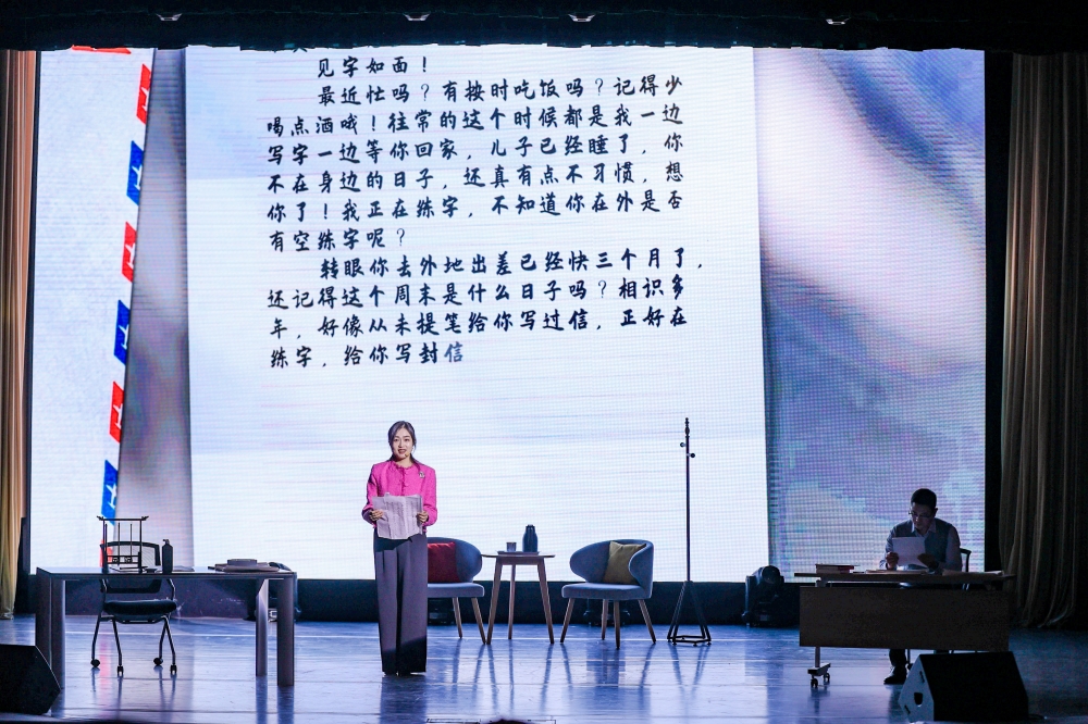 为了更好的诠释该作品,广场公司领队李欣霏精心指导编排作品演绎,不断优化舞台场景、衔接道具摆放,确保节目流程顺畅;演员方倩、谢秀恩、汪亮将真情实感融入作品本身,利用业余时间多次反复练习;团队同事亲自上阵,现场学习,保证灯光效果及时跟进,时空场景及时转换。节目最终以情景演绎、演唱、书画展示等多艺术形式呈现,引人入胜。